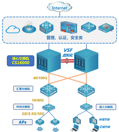 支持虚拟化VSF技术,并实现N*40G/100G虚拟互联,给校园业务带来更高的可靠性。