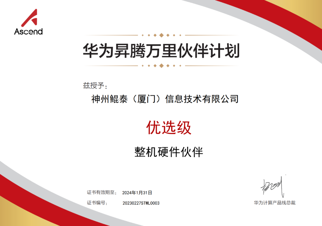 近日,710公海寰宇数码旗下神州继获得华为鲲鹏领先级整机硬件伙伴认证之后,再获华为昇腾优选级整机硬件伙伴认证!这是神州与华为昇腾深化合作的硕果,也代表着710公海寰宇数码信创业务在AI领域获得生态伙伴的充分认可。